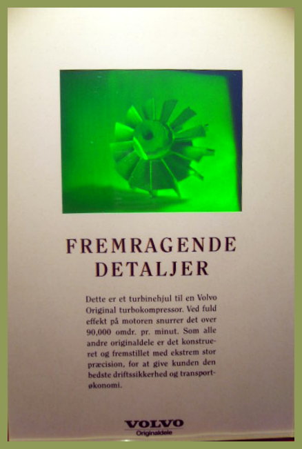 Vi tog fram större display hologram för Volvos internationella mässor, 50×60 cm glashologram som visade på skillnaden i slitage mellan Volvos reservdelar och identiskt lika piratkopior. Demonstrationstavlorna som hologram visade tydligt vilka reservdelar som uppvisade minst slitage. Volvo beställde även säljpremier och give-aways. Volvo Konstförening ordnade en hologramutställning i Göteborg. Foto Mona Forsberg